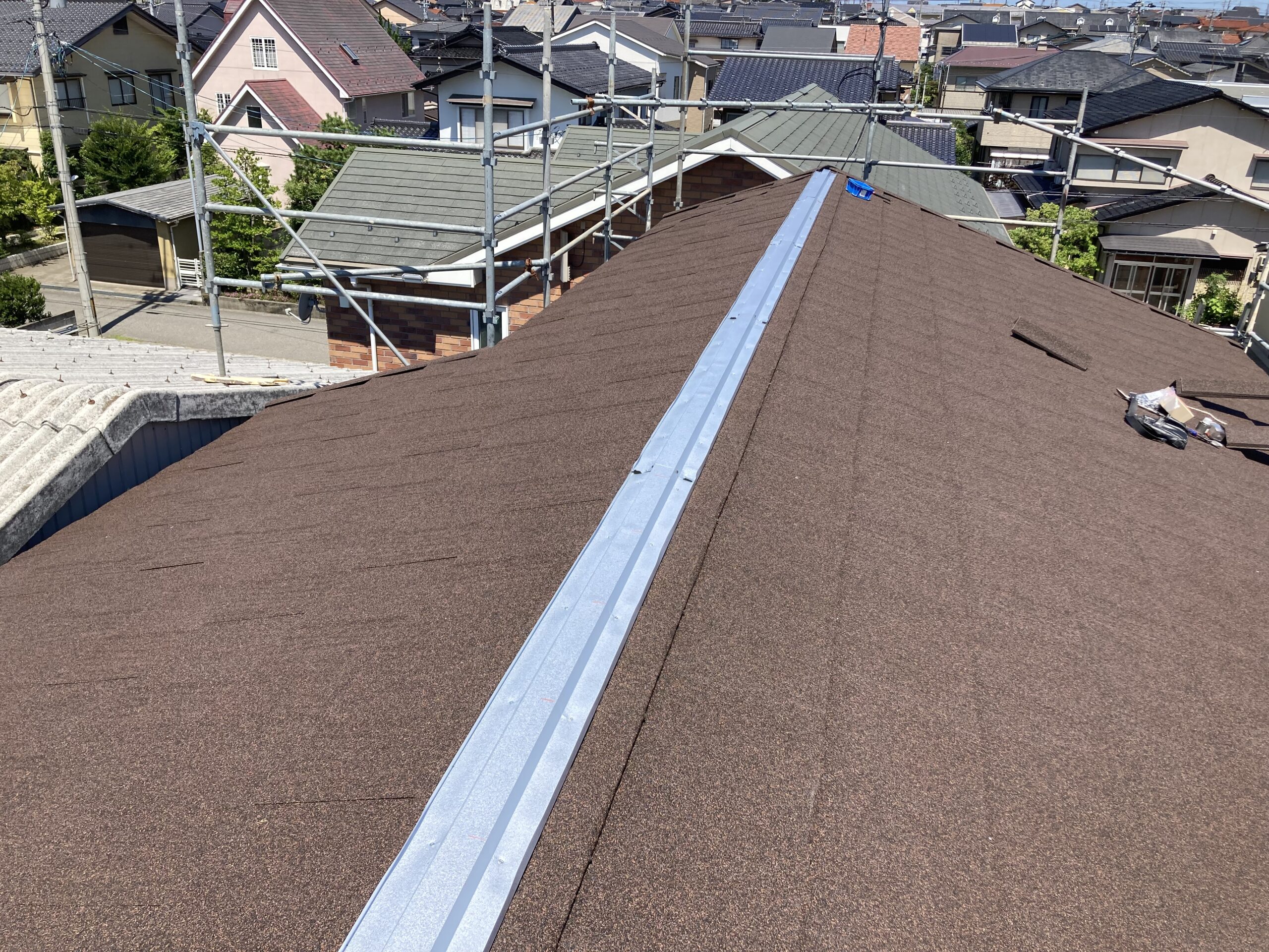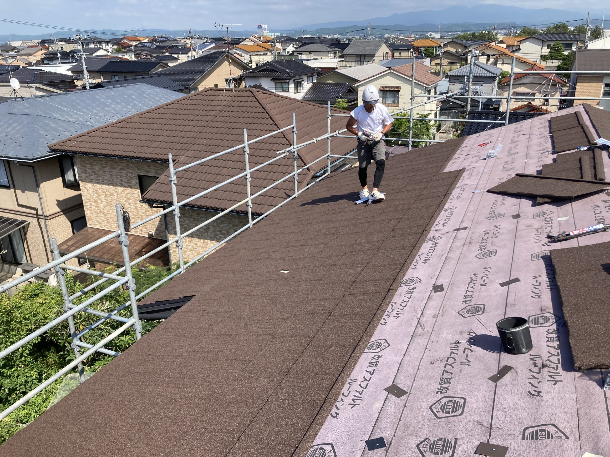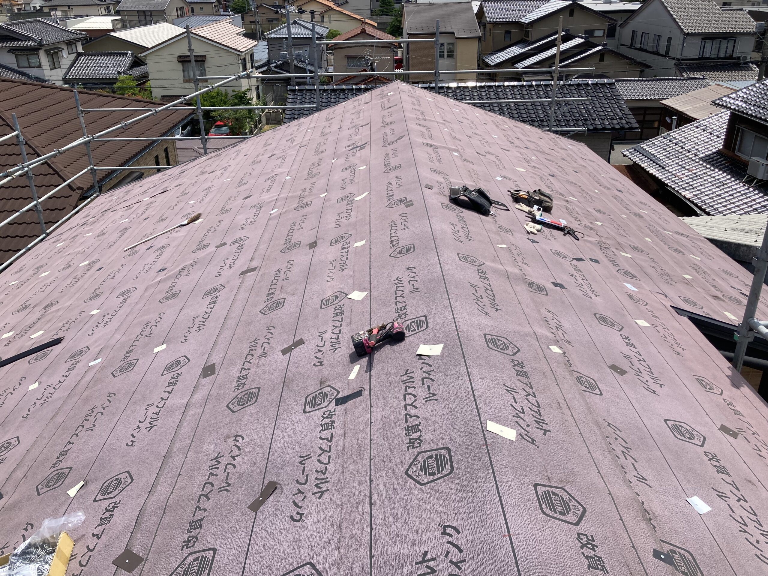 既存のコロニアルの上から新たに防水紙を貼っていきます。二次防水です。
